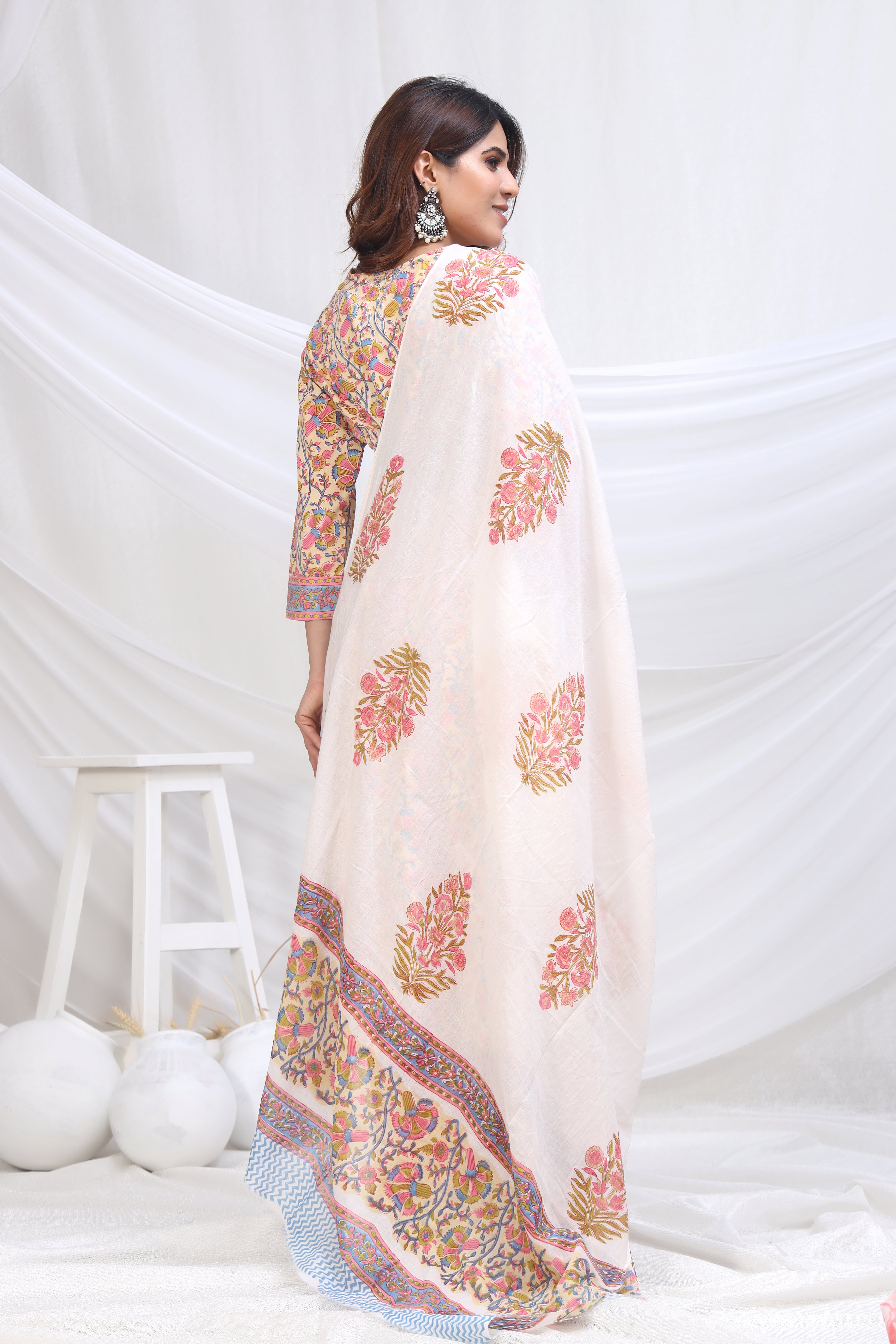 To complete the look, the set includes a stunning white cotton dupatta with a lovely pink and blue floral print that matches the design of the kurta. The dupatta adds a touch of elegance to the entire ensemble and can be styled in various ways to suit your preference.