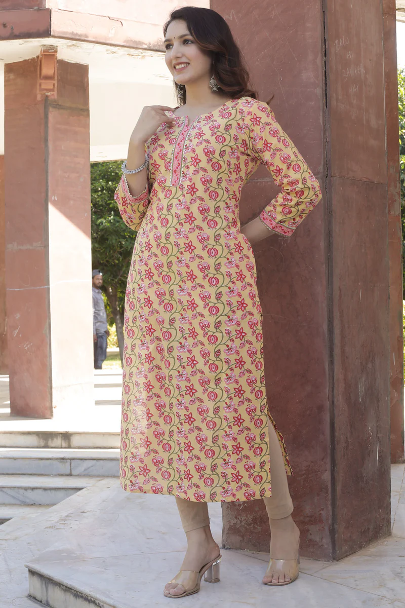 Graced with dainty hand block-printed floral jaal design, our Cotton Straight Kurti - Ruby Red Floral Motif Kurta showcases a charming colour palette. Handcrafted in soft Cotton fabric, this Kurta comes embellished with careful Gota detailing on the yoke and cuffs.